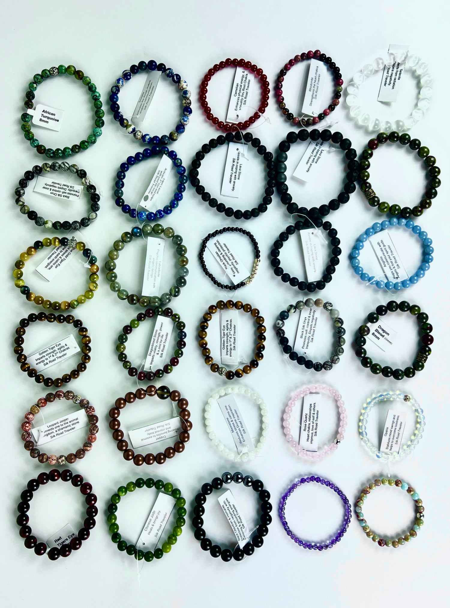 Amethyst 4mm, Angelite 8mm, Aquamarine A+ 6mm, Aquaterra 6mm, Azulite, Malachite 8mm, Black Obisidian+Brass 8mm, Black Obsidian 10mm, Black Obsidian 4mm, Black Obsidian 6mm, Black Obsidian 8mm, Black Silk Onyx 6mm, Black Tourmaline 8mm, Blue Gold Tiger Eye 8mm, Brown Goldstone 8mm, Carmelian plain 6mm, Chinese Jade 8mm, Copper 10mm, Dragonblood 10mm, Dragonblood 8mm, Golden Tiger Eye 6mm, Golden Tiger Eye 8mm, Labradontite 10mm, Labradontite 6mm, Lava Beads, Lava Beads 10mm, Lava Beads 8mm, Leopard Jasper 6mm, Lepidolite 6mm, Moonstone 8mm, Opalite 6mm, Poppy Jasper 10mm, Poppy Jasper 8mm, Red Tiger Eye 10mm, Red Tiger Eye 8mm, Rhodondite 6mm, Rose Quartz 6mm, Shungite 10mm, Shungite 6mm, Shungite 8mm, Shungite flat, Sodalite 8mm, Sodalite 8mm, Tiger Eye mix 6mm